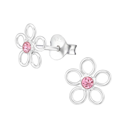 Children's Sterling Silver 'Swirl Flower with Rose Pink Crystal' Stud Earrings