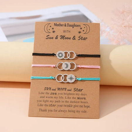 Adjustable Mother and Daughters Sun, Moon and Stars Wish Bracelets with Presentation Card - Multi