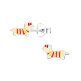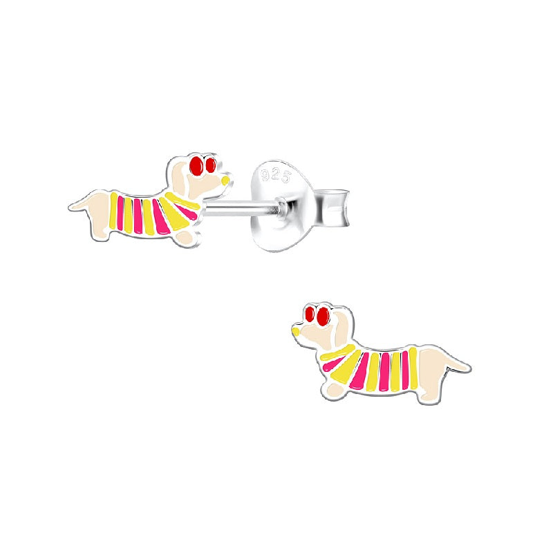 Our super cute 'Sterling Silver Sausage Dog Stud Earrings' make a fun addition to a little girl's jewellery collection. They feature a trendy dachshund wearing a stripy t-shirt and sunglasses.