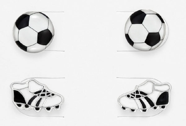 Children's Sterling Silver Set of 2 Pairs of Football Themed Stud Earrings Our stunning set of Sterling Silver Football Themed Stud Earrings feature two pairs of black and white sporty earrings. You will receive 2 pairs of earrings, Football boots and Footballs. This adorable earrings set would make an excellent gift for football loving girls of all ages. Material: 925 Sterling Silver Earring measurements: 10mm x 5mm, 8mm x 8mm Butterfly Back Fastening All our Earrings For Children are Hypoallergenic Please note the picture is enlarged to show detail Supplied in a Liberty Charms gift box.
