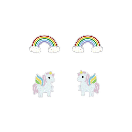 Children's Sterling Silver Set of 2 Pairs of Sparkle Rainbow and Flying Unicorn Stud Earrings